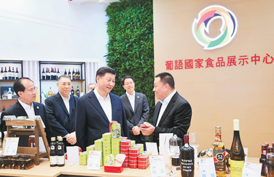 十二月十九日,国家主席习近平在澳门特别行政区行政长官崔世安陪同下,来到中国与葡语国家商贸合作服务平台综合体考察。这是习近平察看平台建设成果展和葡语国家产品展示。新华社记者 谢环驰摄