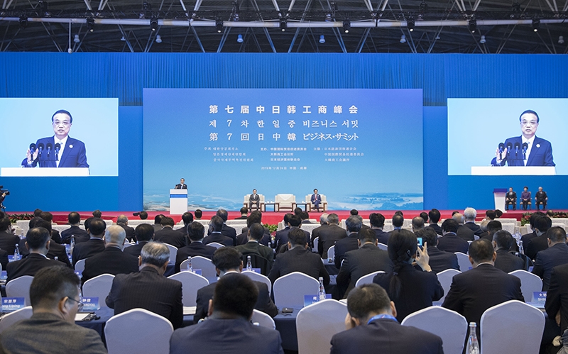 新华社成都12月24日电(记者郑明达、张超群)国务院总理李克强24日上午在四川成都与韩国总统文在寅、日本首相安倍晋三共同出席第七届中日韩工商峰会并致辞。