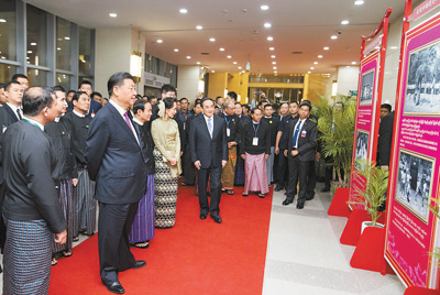 仪式开始前,习近平在缅方领导人陪同下,观看了庆祝中缅建交70周年图片展。图片展记录了中缅建交70年来双方交往中的一幕幕感人画面。习近平不时驻足,认真听取讲解并仔细观看。