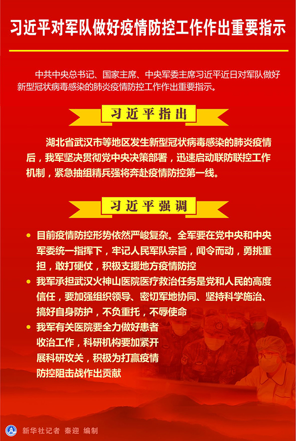 新华社北京1月29日电 中共中央总书记、国家主席、中央军委主席习近平近日对军队做好新型冠状病毒感染的肺炎疫情防控工作作出重要指示。