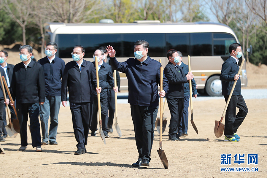 4月3日,党和国家领导人习近平、李克强、栗战书、汪洋、王沪宁、赵乐际、韩正、王岐山等来到北京市大兴区旧宫镇参加首都义务植树活动。这是习近平拿起铁锹走向植树地点,向正在植树的干部群众挥手致意。 新华社记者 庞兴雷 摄