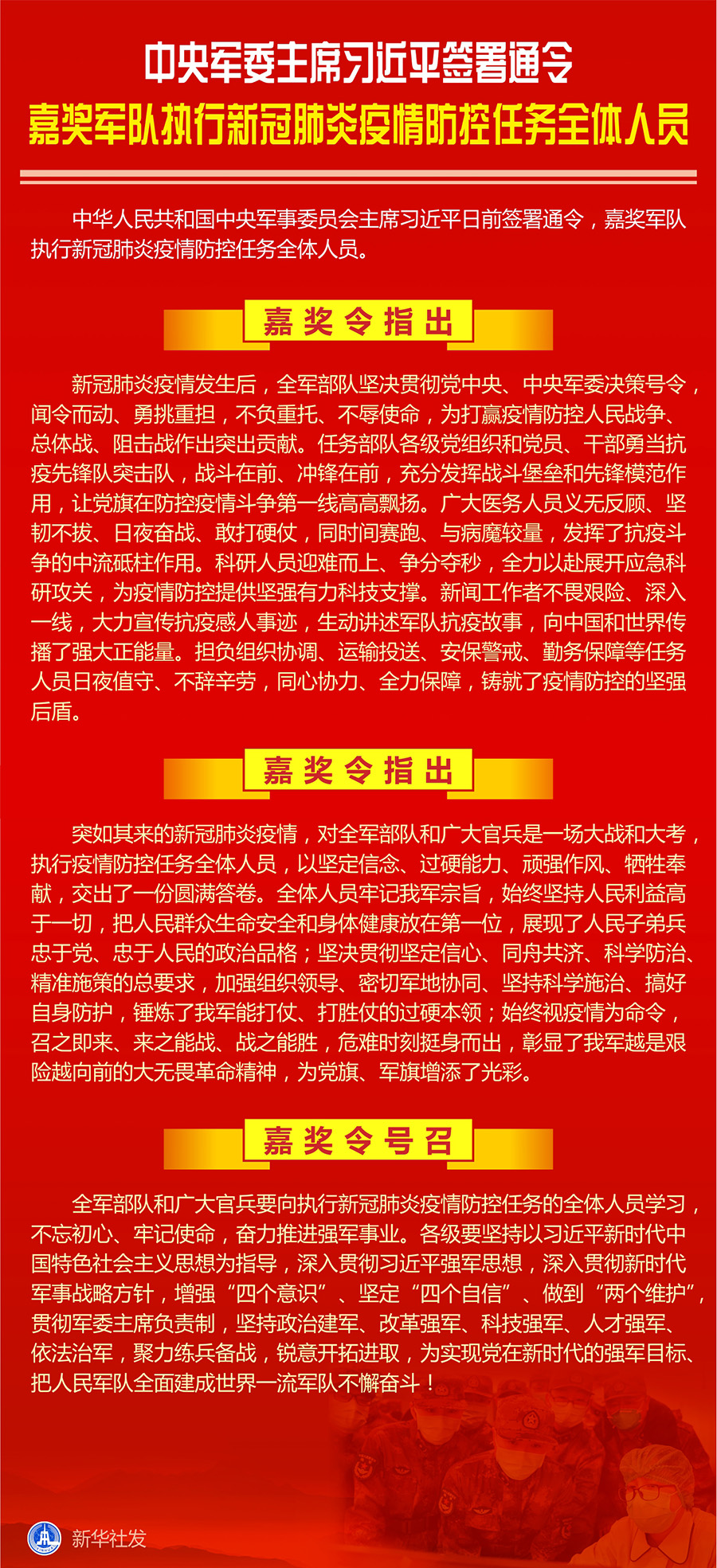 中央军委主席习近平签署通令 嘉奖军队执行新冠肺炎疫情防控任务全体人员