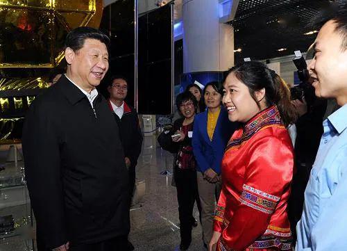 2013年5月4日,习近平总书记来到中国航天科技集团公司中国空间技术研究院,同各界优秀青年代表座谈并发表重要讲话。这是座谈会前,总书记和在展厅参观的优秀青年代表交谈(新华社记者 饶爱民 摄)
