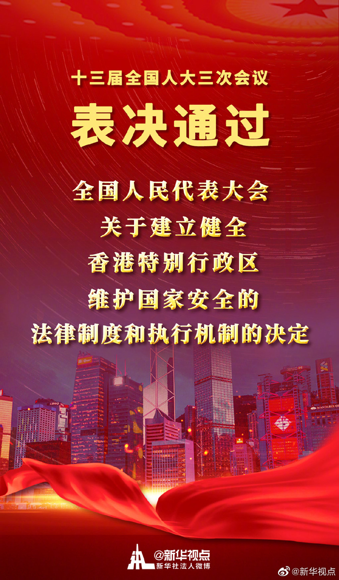 新华社北京5月28日电 5月28日下午,十三届全国人大三次会议以高票表决通过《全国人民代表大会关于建立健全香港特别行政区维护国家安全的法律制度和执行机制的决定》。