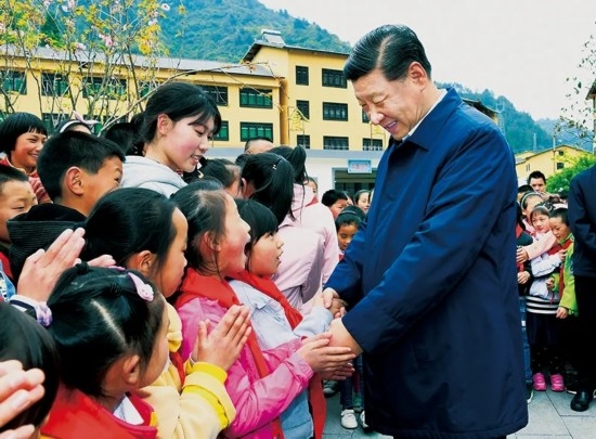 2019年4月15日至17日,习近平在重庆考察并主持召开解决“两不愁三保障”突出问题座谈会。这是15日,习近平在石柱土家族自治县中益乡小学同学生们交谈。