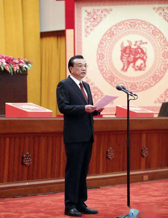 2021年2月10日,中共中央、国务院在北京人民大会堂举行2021年春节团拜会。中共中央政治局常委、国务院总理李克强主持团拜会(新华社记者 刘卫兵 摄)