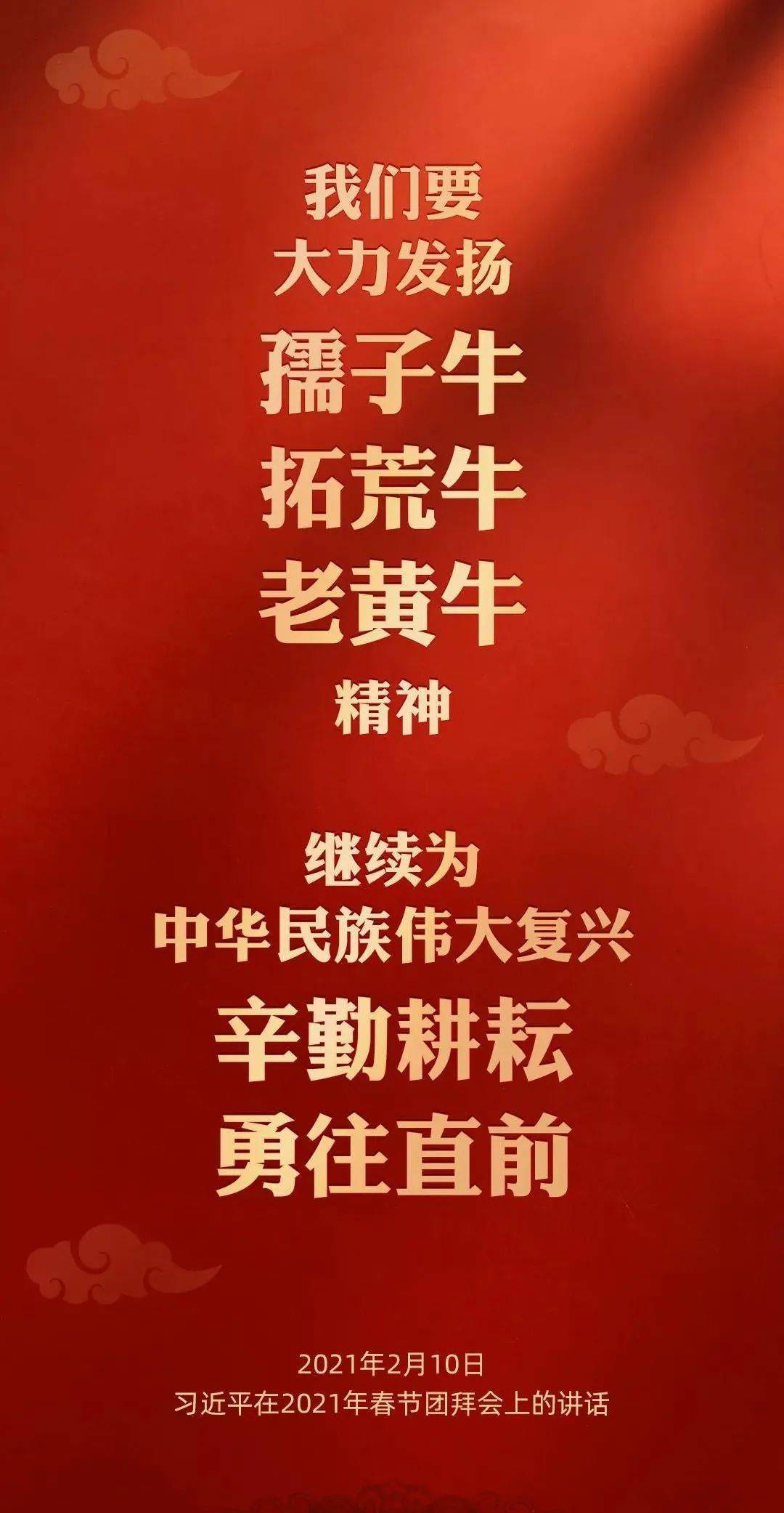 在中华文化里,牛是勤劳、奉献、奋进、力量的象征。人们把为民服务、无私奉献比喻为孺子牛,把创新发展、攻坚克难比喻为拓荒牛,把艰苦奋斗、吃苦耐劳比喻为老黄牛。前进道路上,我们要大力发扬孺子牛、拓荒牛、老黄牛精神,以不怕苦、能吃苦的牛劲牛力,不用扬鞭自奋蹄,继续为中华民族伟大复兴辛勤耕耘、勇往直前,在新时代创造新的历史辉煌!