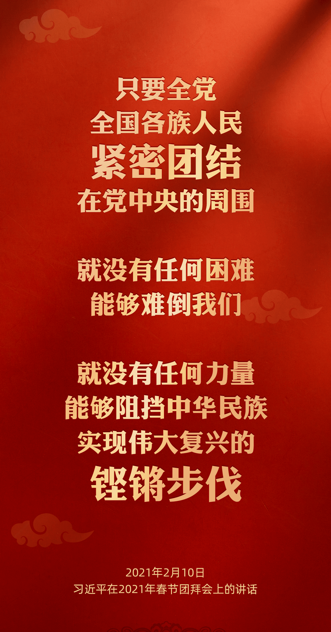 新华社北京2月10日电中共中央、国务院10日上午在人民大会堂举行2021年春节团拜会。中共中央总书记、国家主席、中央军委主席习近平发表讲话,代表党中央、国务院,向全国各族人民,向香港特别行政区同胞、澳门特别行政区同胞、台湾同胞和海外侨胞拜年。