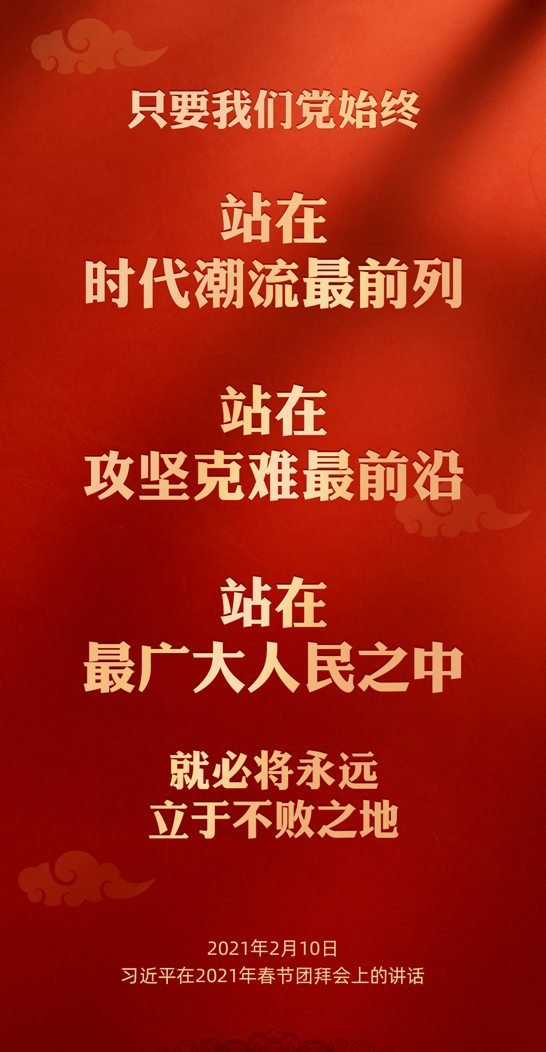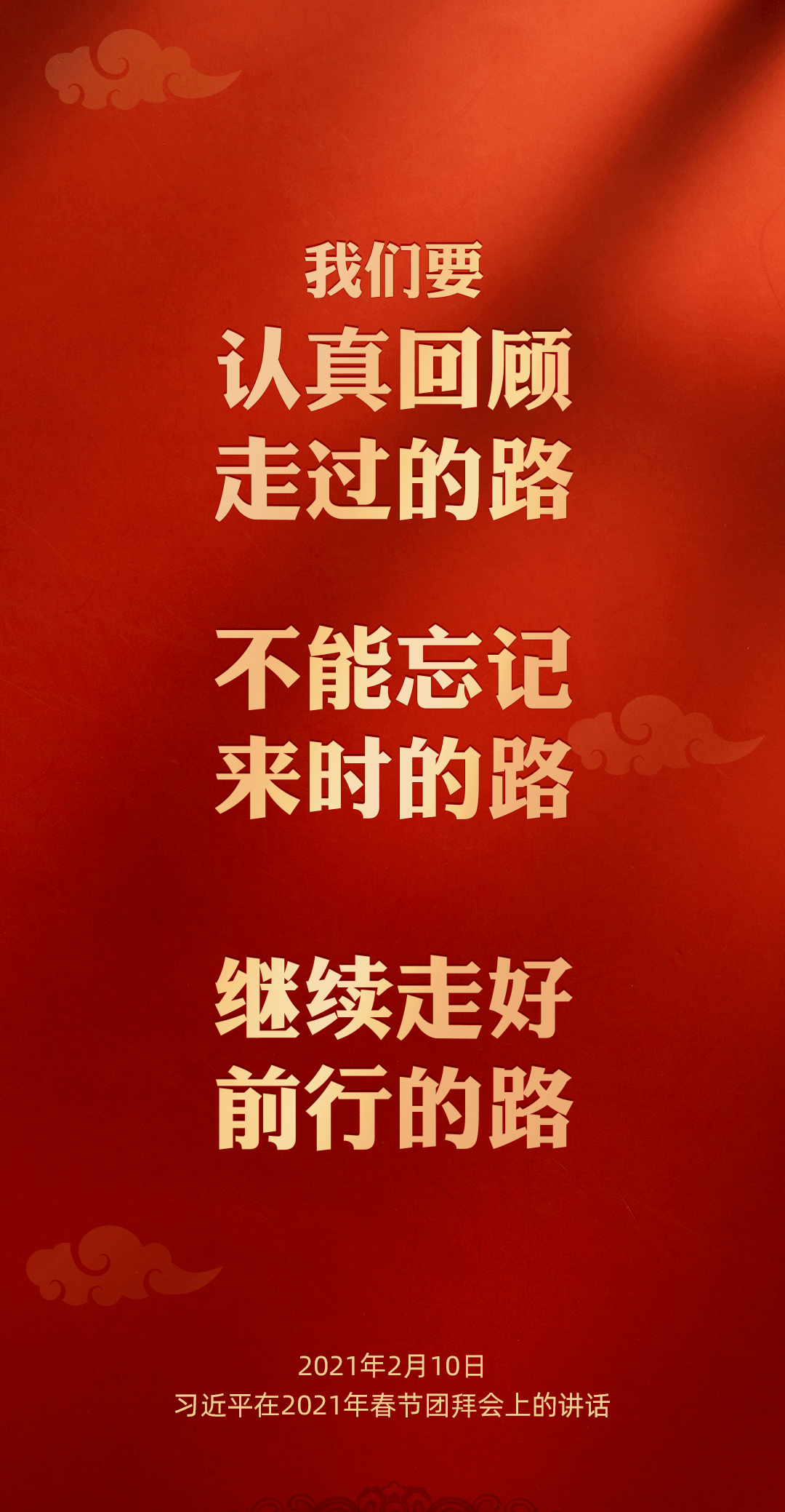 新的一年,我们要全面贯彻党的十九大和十九届二中、三中、四中、五中全会精神,坚持稳中求进工作总基调,立足新发展阶段、贯彻新发展理念、构建新发展格局,以推动高质量发展为主题,以深化供给侧结构性改革为主线,以改革创新为根本动力,以满足人民日益增长的美好生活需要为根本目的,统筹推进“五位一体”总体布局、协调推进“四个全面”战略布局,统筹发展和安全,巩固拓展疫情防控和经济社会发展成果,努力实现“十四五”时期发展开好局、起好步,以优异成绩迎接中国共产党成立100周年。