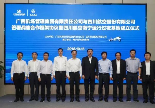 10月15日 四川航空股份有限公司与广西机场集团签署战略合作框架协议,并在南宁吴圩国际机场举行川航南宁运行过夜基地授牌仪式。至此,川航在成都总部以外的分公司和基地数量达到11个。