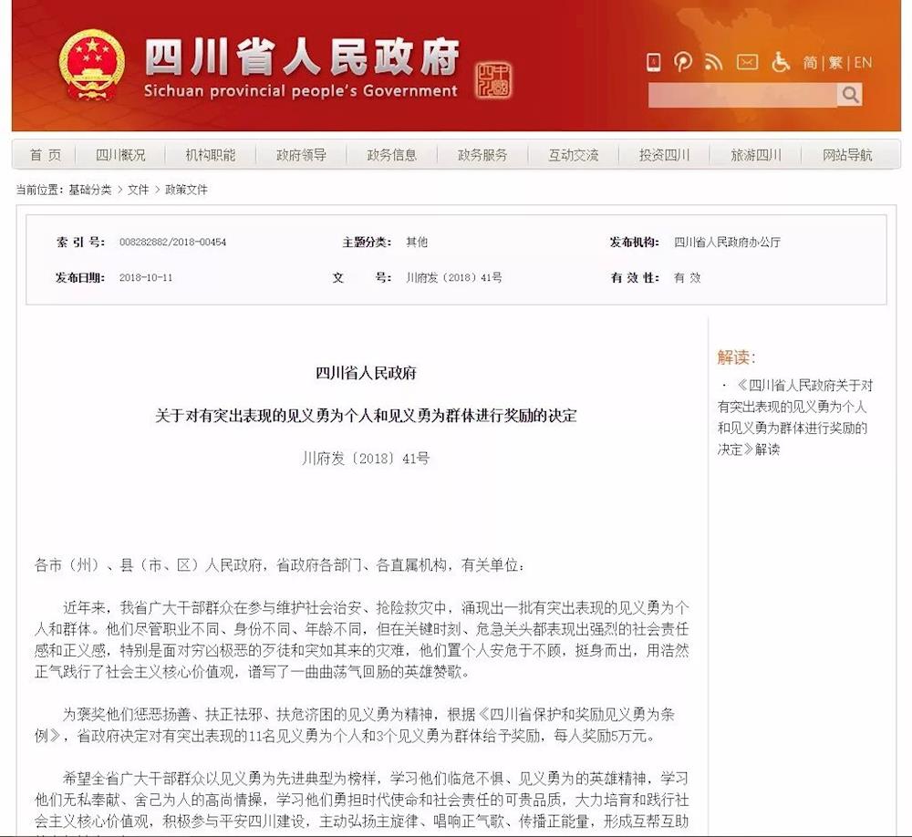 10月20日 《四川日报》报道,10月11日,省政府印发《关于对有突出表现的见义勇为个人和见义勇为群体进行奖励的决定》,对有突出表现的郭仕华等11名见义勇为个人和3个见义勇为群体给予奖励,每人奖励5万元。