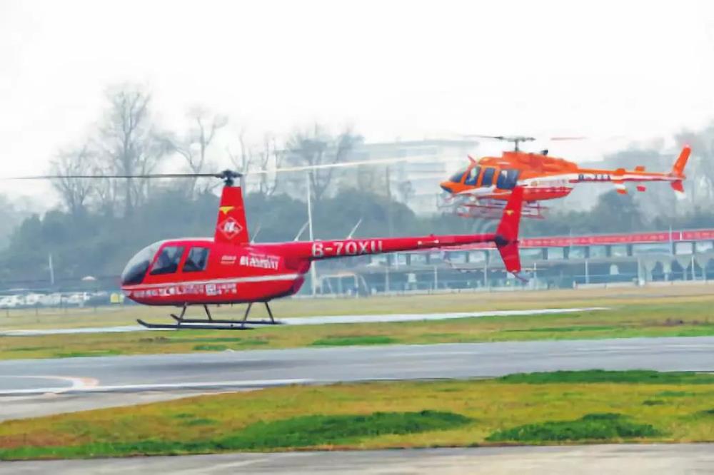 “川报号”直升机与其他直升机从洛带机场起飞,执行固定空域飞行(图片来源:四川日报)