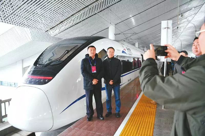 2019年1月3日,“天府号”即将出发,乘客在车头前合影 (肖雨杨 摄,图片来源:四川日报)