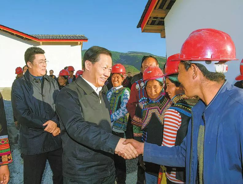 1月2日,省委书记彭清华到昭觉县普诗乡李子村调研,了解脱贫攻坚工作推进情况,看望慰问在易地扶贫搬迁安置点参加房屋建设的当地彝族群众(欧阳杰摄,图片来源:四川日报)