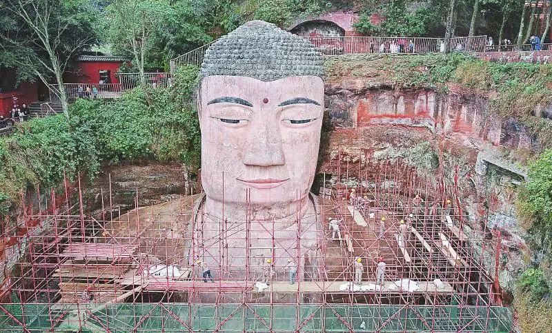 3月19日 乐山大佛头部的脚手架已开始拆除。乐山大佛胸腹部残损区域抢救性保护前期研究及勘测现场作业工作将于3月底全面完成,景区将于4月1日正式向游客重新开放。