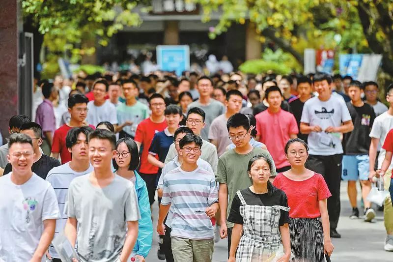 6月7日,成都七中林荫校区考点,第一科目考试完毕,大批考生涌出考场,脸上洋溢着笑容(四川日报记者 杨树 摄,图片来源:四川日报)