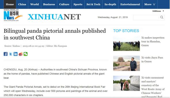 8月21日00:44,新华社面向全球发出全英文报道:中国西南地区出版的双语熊猫画报