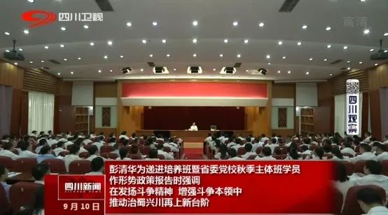 9月10日 上午省委书记彭清华来到省委党校为治蜀兴川执政骨干递进培养班暨秋季主体班学员作形势政策报告。他在报告中强调,全省广大党员、干部要认真学习贯彻习近平总书记在中央党校(国家行政学院)中青年干部培训班开班式上的重要讲话精神,善于把握大势、着眼全局,把自身工作放在大局下来思考、谋划和推进,发扬斗争精神、增强斗争本领,齐心协力推动治蜀兴川再上新台阶。