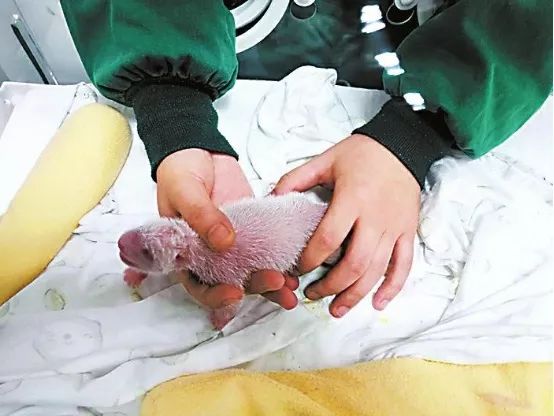 工作人员在照顾双胞胎中的老大(中国大熊猫保护研究中心供图 图片来源:四川日报)