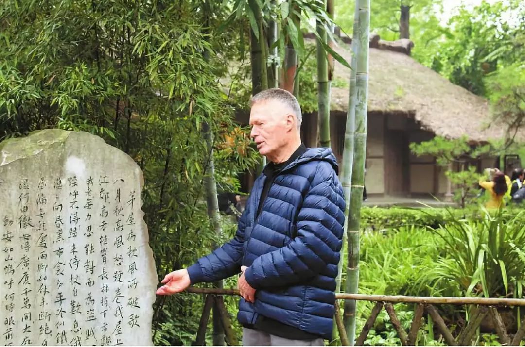 10月13日,2008年诺贝尔文学奖得主、法国作家让·马瑞尔·古斯塔夫·勒克莱齐奥到访成都杜甫草堂博物馆。图为勒克莱齐奥在草堂用法语朗诵《茅屋为秋风所破歌》(肖姗姗摄,图片来源:四川日报)