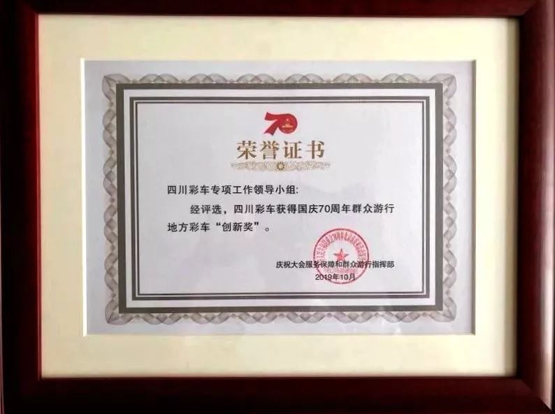 近日,四川彩车专项工作领导小组荣获国庆70周年群众游行地方彩车“创新奖”(图片来源:“安逸走四川”微信公众号)