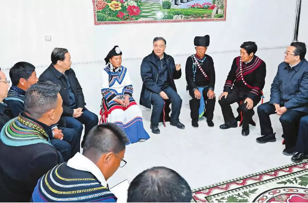 12月12日至14日,中共中央政治局常委、全国政协主席汪洋在四川凉山彝族自治州调研脱贫攻坚工作。这是12月13日,汪洋在昭觉县解放乡火普村同彝族群众座谈(新华社记者 饶爱民 摄,图片来源:四川日报)