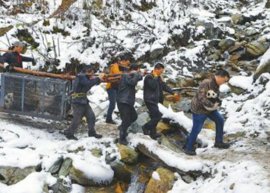 12月12日,科研人员怀抱着大熊猫“乔乔”的幼崽走在前面,“乔乔”躺在群众抬着的笼子里面(图片来源:四川日报)