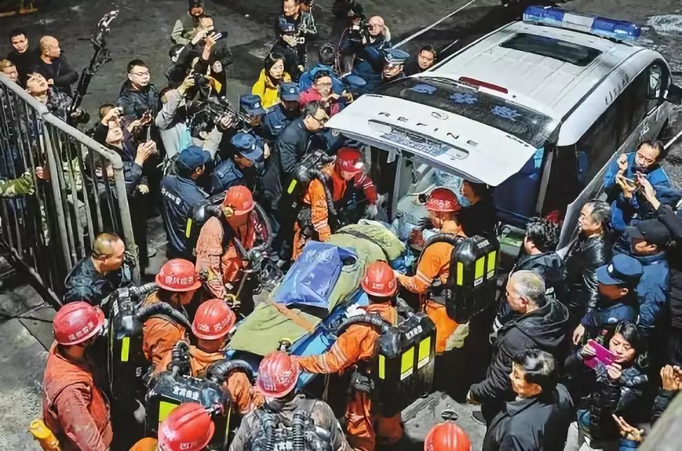 12月18日,杉木树煤矿最后一名受困人员被送上救护车(四川日报记者 杨树 摄,图片来源:四川日报)