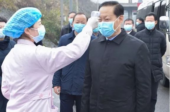 2月1日,省委书记彭清华到成自泸高速威远连界出口卫生防疫站,督导重要交通节点疫情防控举措落实情况,下车后主动配合医务人员进行体温检测(图片来源:四川在线)