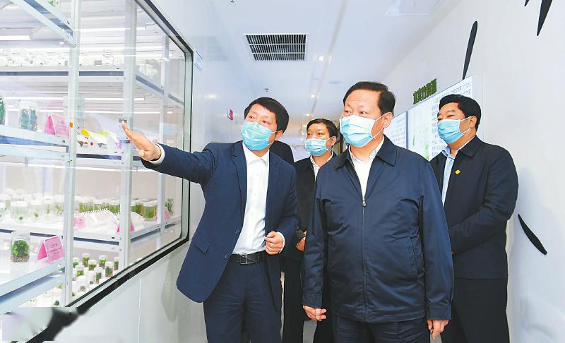 4月26日,省委书记彭清华到宜宾三江新区产教融合示范区科技创新中心调研,在宜宾竹产业研究院,了解当地搭建研发创新平台、推进竹产业发展情况(四川日报记者 欧阳杰 摄,图片来源:四川日报)