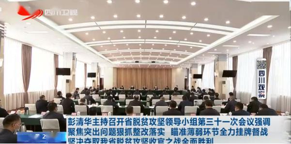 4月24日省脱贫攻坚领导小组第三十一次会议召开,省委书记、领导小组组长彭清华主持会议并讲话。他强调,今年脱贫攻坚任务艰巨繁重,每一天都非常重要,容不得丝毫松劲懈怠。全省上下要坚决贯彻习近平总书记重要讲话精神特别是在陕西考察时对脱贫攻坚工作提出的重要要求,全面落实党中央各项决策部署,坚持在常态化疫情防控中决战决胜脱贫攻坚,聚焦突出问题狠抓整改落实,瞄准薄弱环节全力挂牌督战,将目标任务细化到每一周、落实到每一天,坚决夺取收官之战全面胜利。 省委副书记、领导小组副组长邓小刚出席会议。