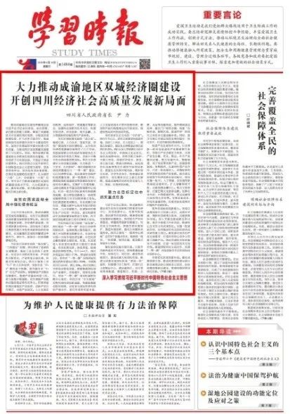 6月10日 《学习时报》头版头条“深入学习贯彻习近平新时代中国特色社会主义思想·大有专论”栏目刊载中共四川省委副书记、省长尹力的署名文章《大力推动成渝地区双城经济圈建设 开创四川经济社会高质量发展新局面》。