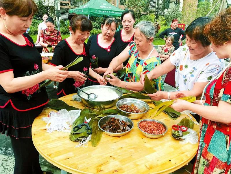 6月23日,德阳市旌阳区黄许镇新新社区开展以“粽叶飘香过端午 幸福和谐邻里情”为主题的端午节包粽子活动(唐渝川 摄,图片来源:四川日报)