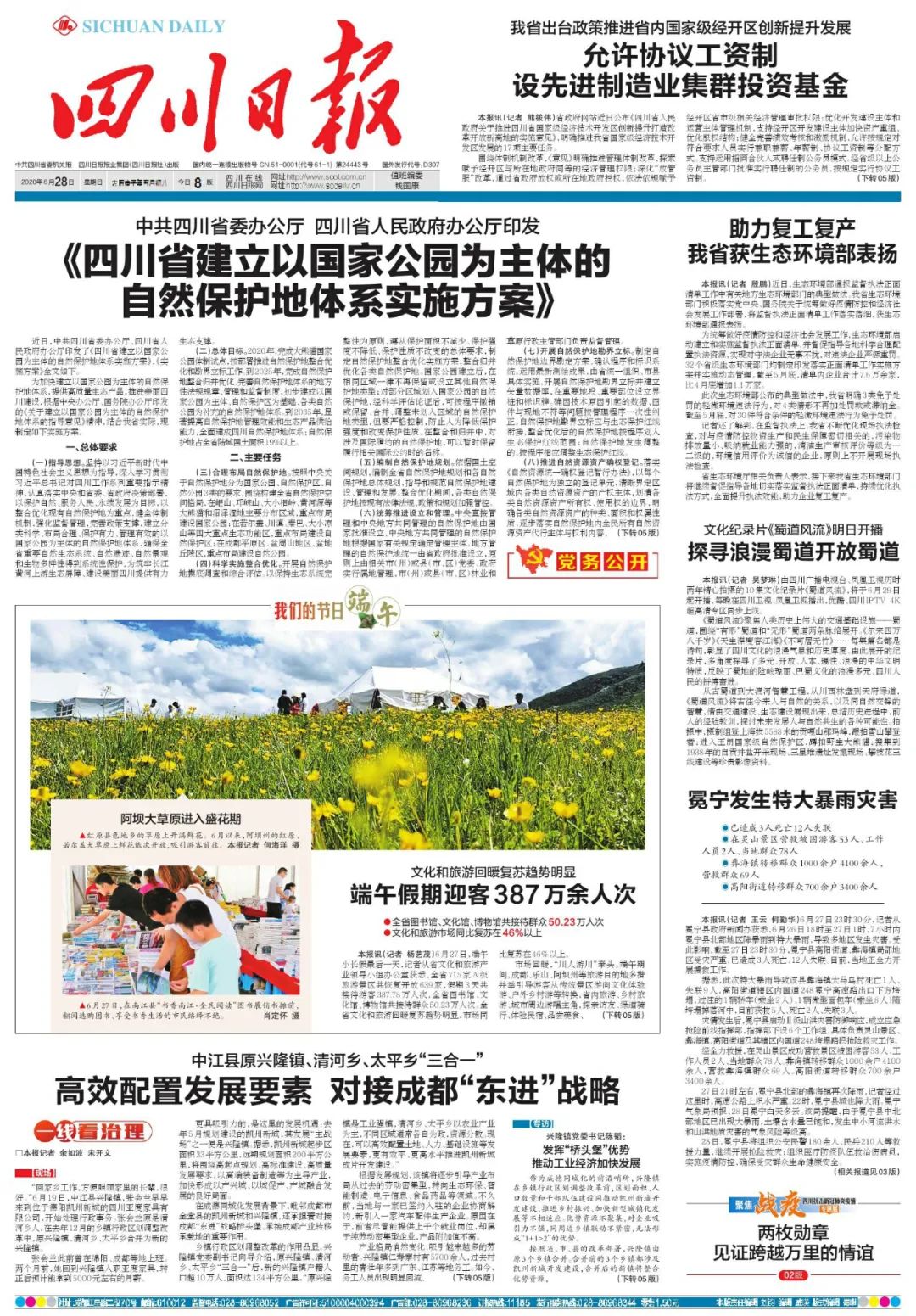 2020年6月28日《四川日报》第1版报道:中共四川省委办公厅四川省人民政府办公厅印发《四川省建立以国家公园为主体的自然保护地体系实施方案》