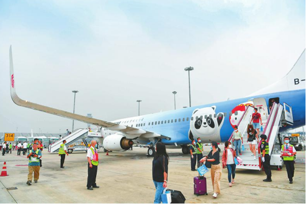 “冬奥冰雪号”首批乘客走下飞机(四川日报记者 何海洋 摄,图片来源:四川日报)