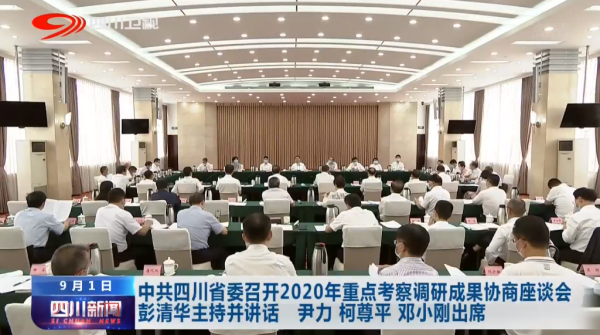 9月1日 四川省委2020年重点考察调研成果协商座谈会在成都召开,省委书记彭清华主持会议并讲话。他指出,面对新发展阶段的新机遇新挑战,希望各民主党派省委、省工商联和无党派人士继续坚持问题导向、发展导向、目标导向相统一,紧扣全省中心大局,广泛深入开展调查研究,充分凝聚各方智慧和力量,齐心协力推动四川各项事业实现新发展、迈上新台阶。省委副书记、省长尹力,省政协主席柯尊平,省委副书记邓小刚出席会议。