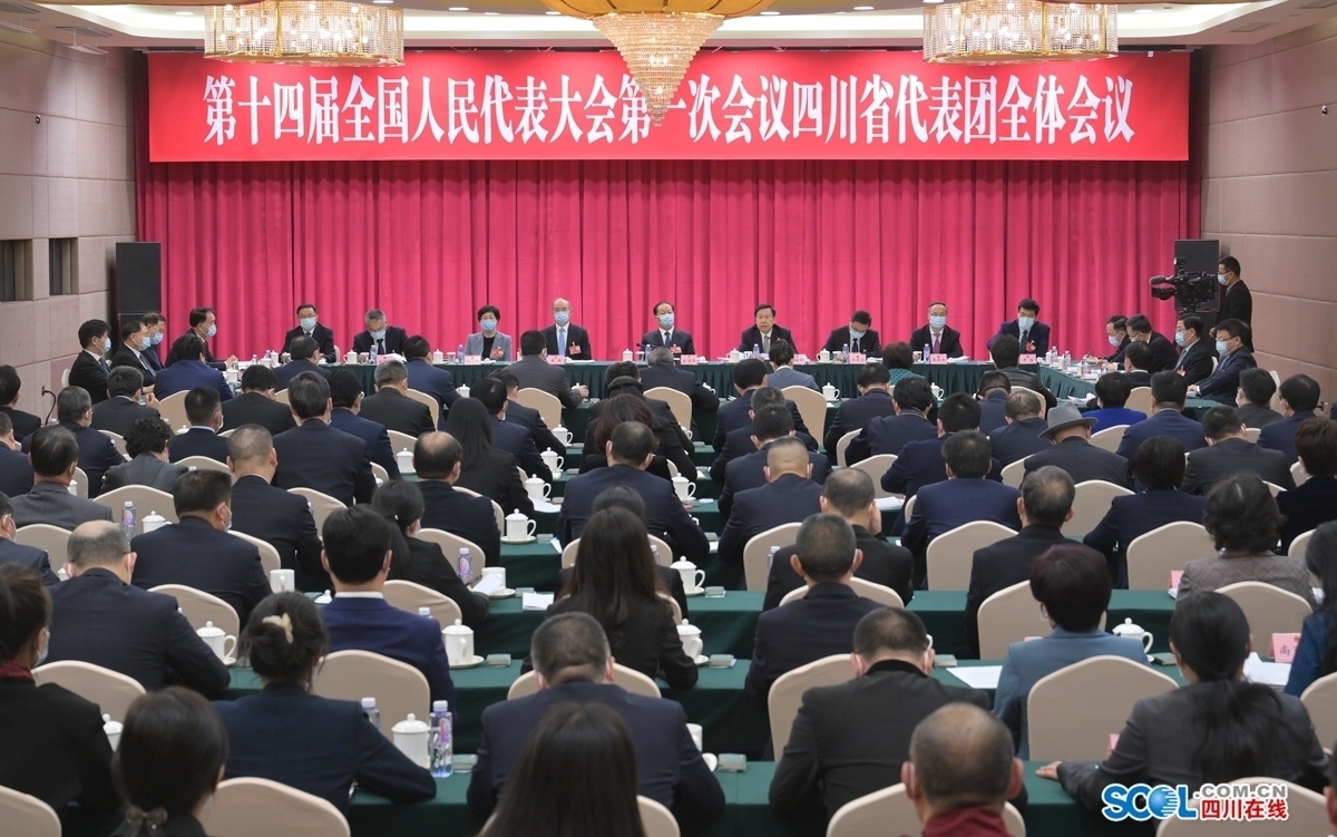 3月12日下午,十四届全国人大一次会议四川代表团在驻地举行全体会议。全国人大常委会副委员长彭清华出席会议,省委书记、省人大常委会主任、代表团团长王晓晖主持会议并讲话,省委副书记、省长、代表团副团长黄强参加。