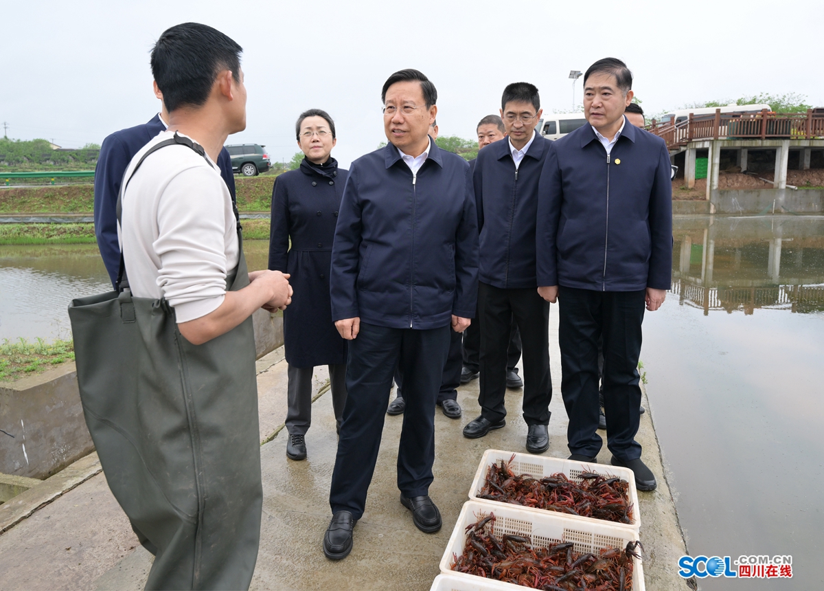 4月10日,省委书记、省人大常委会主任王晓晖到隆昌市内荣农高区现代农业产业示范园调研,与种粮农户交流,了解“稻虾共养”模式助农增收情况。