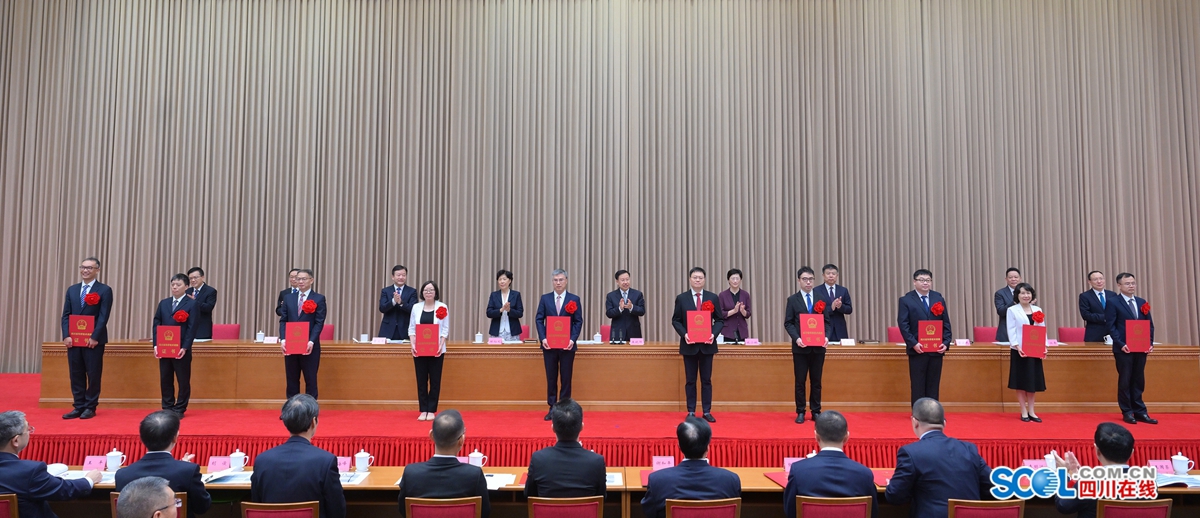 会上,宣读了《四川省人民政府关于2023年度四川省科学技术奖励的决定》。在热烈掌声中,王晓晖首先为省科学技术杰出贡献奖获得者杜祥琬、李安民颁发证书。随后,王晓晖、施小琳、田向利等省领导为省杰出青年科学技术创新奖、自然科学奖、技术发明奖、科学技术进步奖的获奖代表颁发证书。获奖代表杜祥琬和成都市、绵阳科技城、国家高端航空装备技术创新中心、四川华鲲振宇智能科技公司负责同志作了交流发言。