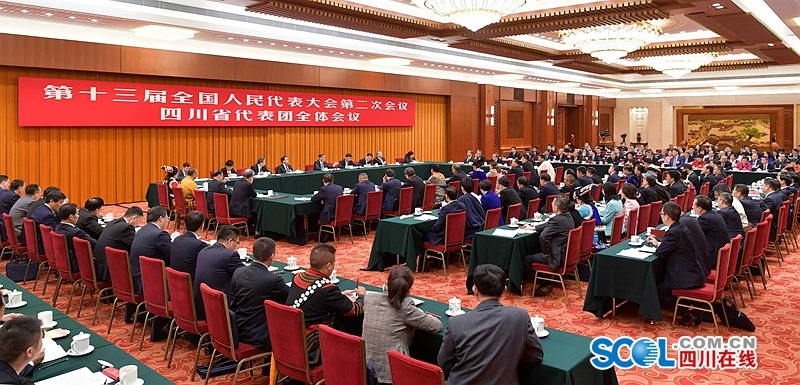 四川在线消息(记者 张守帅 摄影 欧阳杰)3月5日下午,十三届全国人大二次会议四川代表团在人民大会堂东大厅举行全体会议,集中审议李克强总理所作的政府工作报告。