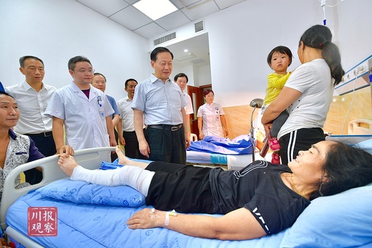 彭清华到长宁县中医院看望慰问受伤群众,详细询问他们的伤情以及治疗进展情况。
