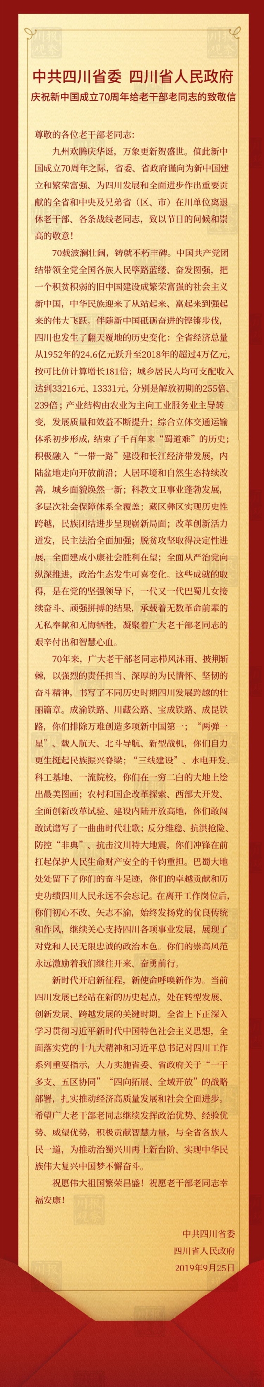 四川省委省政府向老干部老同志发出致敬信:祝愿伟大祖国繁荣昌盛!祝愿老干部老同志幸福安康!