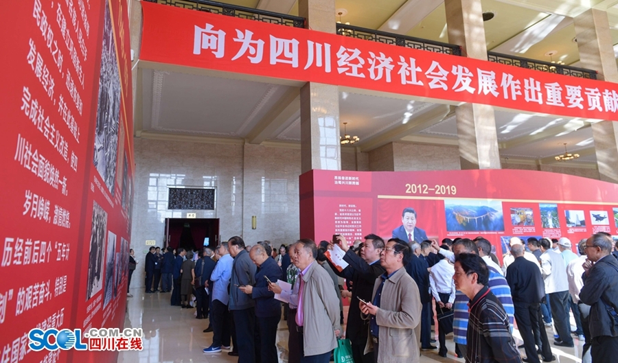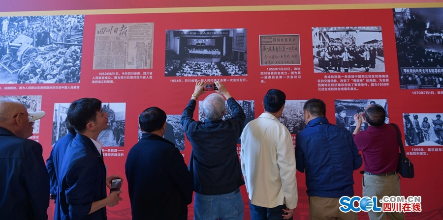 老干部老同志观看反映新中国成立70年来四川发展历程的展板。