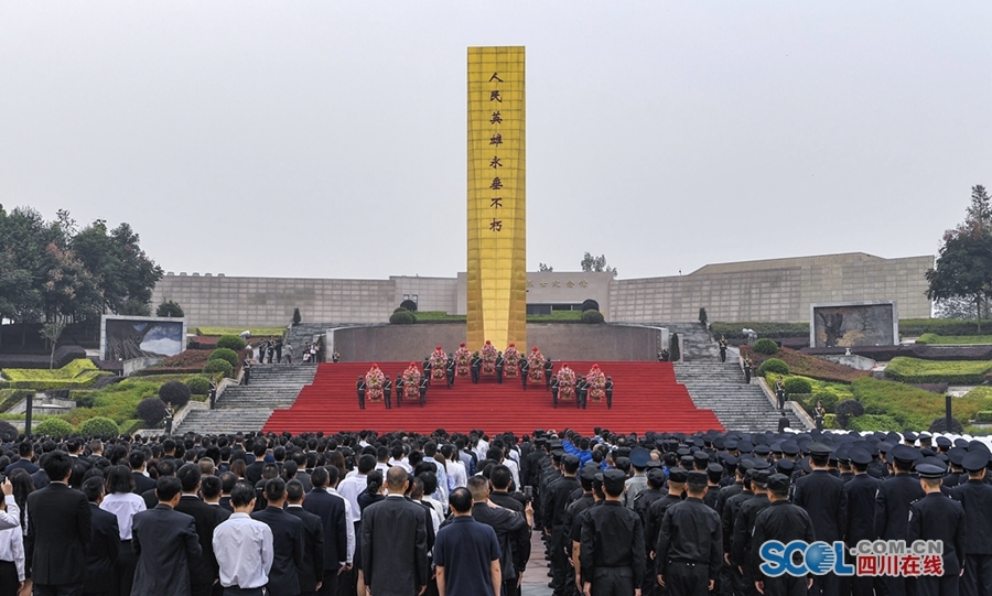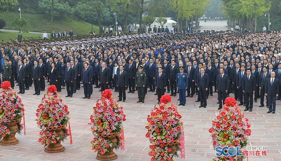 省委常委、成都市委书记范锐平主持仪式。省委、省人大常委会、省政府、省政协、省法院、省检察院、西部战区、西部战区空军、成都军区善后办、省军区、陆军第77集团军、武警四川省总队、成都市有关领导,省直各部门负责同志,各民主党派省委、省工商联负责人和无党派人士代表,成都市机关干部和各界群众代表,烈士遗属和老战士代表,高校、中小学师生代表和驻蓉武警部队官兵代表等参加敬献花篮仪式。