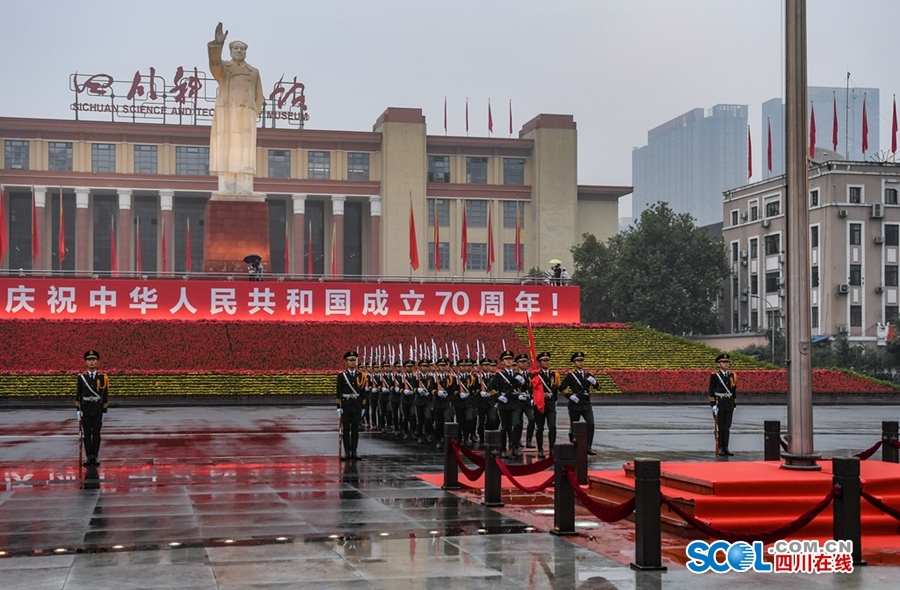 清晨的天府广场,细雨濛濛、彩旗飘扬,“热烈庆祝中华人民共和国成立70周年”的横幅格外醒目,气氛庄严而热烈。7时许,伴着《歌唱祖国》《我爱你中国》《我和我的祖国》等乐曲,参加升国旗仪式的各界群众代表在晨风秋雨中陆续来到广场,满怀对伟大祖国的崇敬之情,带着各自对祖国生日的美好祝愿,整齐列队、静静肃立,等候神圣时刻的来临。
