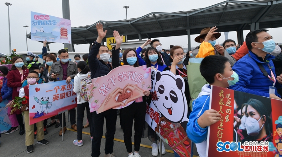 援鄂医疗卫生队归来牵动着全川人民的心。成都双流国际机场停机坪内,悬挂着“热烈欢迎四川援助湖北医疗卫生队凯旋”横幅,医疗卫生队员家属代表拿着孩子手绘图画和“终于等到你”“想见你、来接你”等标语牌在等候区翘首以待,满怀喜悦和激动之情。