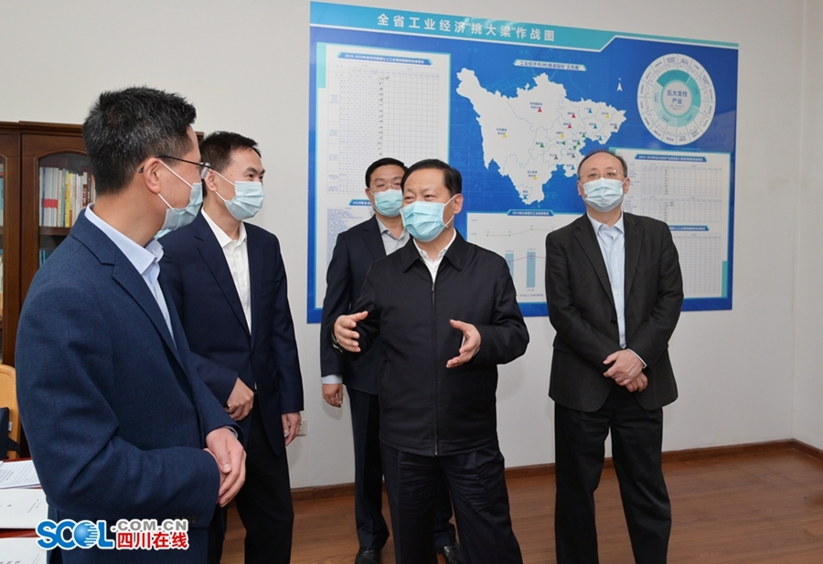 调研中,彭清华、尹力来到经济和信息化厅工业经济综合处,与工作人员亲切交谈,详细了解全省加快工业企业复工复产、重大产业项目建设、推动工业经济增长及成渝地区双城经济圈产业链协同发展等情况,对经济和信息化厅和相关部门在疫情防控期间的良好工作成效给予肯定。