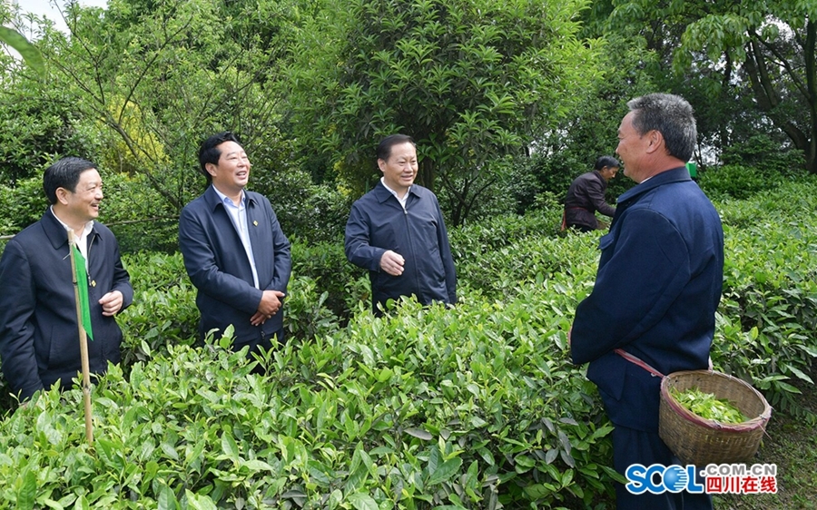 4月27日,省委书记彭清华到宜宾市高县来复镇大屋村调研,与正在茶园劳动的村民交谈,了解生产生活及巩固脱贫攻坚成果等情况。