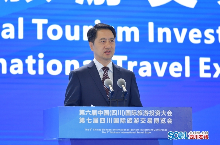 尹力在致辞中代表四川省委省政府和四川人民,向线上线下的嘉宾和朋友表示欢迎。他说,四川历史文化深厚,山川秀美辽阔,民族风情浓郁,发展文化旅游潜力巨大。四川省委省政府深入学习贯彻习近平新时代中国特色社会主义思想和习近平总书记对四川工作系列重要指示精神,围绕建设文化强省旅游强省和世界重要旅游目的地,把项目储备和招商引资作为推动文化旅游发展的重要抓手,谋划了一批标志性引领性文旅产业项目,吸引了各类资本积极投资文旅产业,加快将资源优势转化为发展优势。当前,四川正深度参与“一带一路”建设、长江经济带发展和新时代西部大开发,大力推动成渝地区双城经济圈建设,助推形成以国内大循环为主体、国内国际双循环相互促进的新发展格局。我们将进一步加强开放交流合作,顺应旅游消费提质转型升级新趋势,聚集海内外优势文化旅游资源,加快推进重点文旅项目建设,着力构建旅游产品新业态、新模式、新体系,全力做强“天府旅游名县”等系列文旅品牌,持续推进旅游业高质量发展。欢迎大家多来四川走走看看,体验天府之国的独特魅力和蓬勃生机。期待各位企业家朋友积极参与到四川新一轮旅游大发展热潮中,四川将坚定不移支持企业在川发展,让大家安心创业、舒心生活,开创互利共赢新未来。