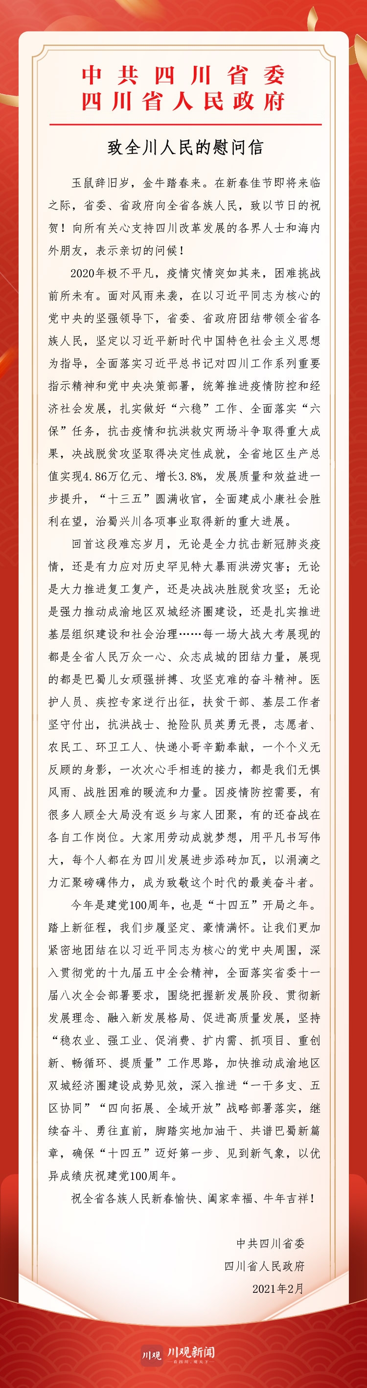 今年是建党100周年,也是“十四五”开局之年。踏上新征程,我们步履坚定、豪情满怀。让我们更加紧密地团结在以习近平同志为核心的党中央周围,深入贯彻党的十九届五中全会精神,全面落实省委十一届八次全会部署要求,围绕把握新发展阶段、贯彻新发展理念、融入新发展格局、促进高质量发展,坚持“稳农业、强工业、促消费、扩内需、抓项目、重创新、畅循环、提质量”工作思路,加快推动成渝地区双城经济圈建设成势见效,深入推进“一干多支、五区协同”“四向拓展、全域开放”战略部署落实,继续奋斗、勇往直前,脚踏实地加油干、共谱巴蜀新篇章,确保“十四五”迈好第一步、见到新气象,以优异成绩庆祝建党100周年。